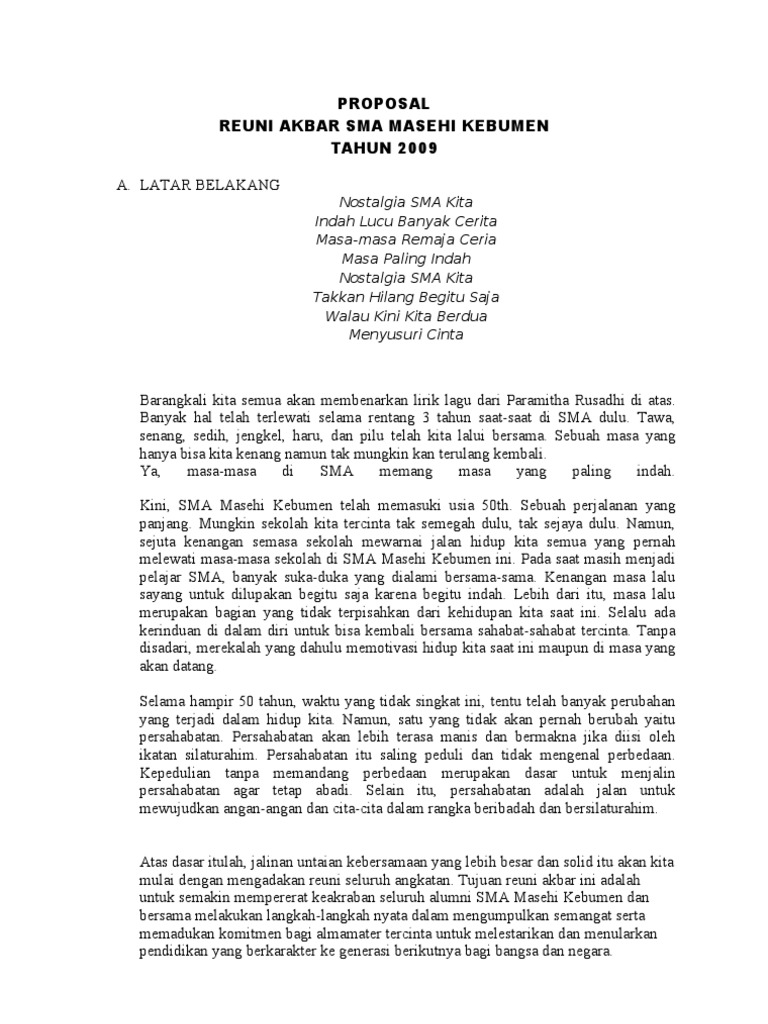 Sebenarnya proposal sendiri bukan merupakan hal aneh, malah ini adalah wajib bagi organisasi manapun yang ingin membuat kegiatan dan meminta perizinan, entah pada pihak sekolah atau lembaga tertentu. Rendahnya sosial ekonomi bagi sebagian orang tua siswa/masyarakat. Semoga dzat yang maha pengasih dan penyayang meridhoi rencana mulia untuk menyambung kembali tali silaturahim. Alumni smp n painan angkatan 1990 proposal malam malapeh taragak oleh : Proposal penelitian disusun secara sistematis dan bersifat ilmiah, sehingga sudah sebaiknya proposal yang diajukan menggunakan kalimat yang sesuai dengan tujuan proposal yang dibuat. Kebersamaan, dan kecintaan pada almamater untuk memberikan 5. Download contoh proposal kegiatan reuni akbar sma, smk, ma atau yang sederajat. Reuni smp 245 jakarta angkatan 1997 merajut yang hilang, memupuk persaudaraan' a. Contoh proposal non formal yaitu proposal pengajuan reuni sekolah. Reuni 1 dekade smp negeri 1 blitarlulusan 200510 years and still countinga. Nah, pada kesempatan pagi yang baik ini, admin akan mencoba untuk menulis sebuah contoh proposal reuni akbar tingkat sekolah menengah atas (sma)/ yang. (padahal mereka sekolah di smp yang sama). Pedoman pemilihan guru kepala sekolah dan pengawas sekolah.